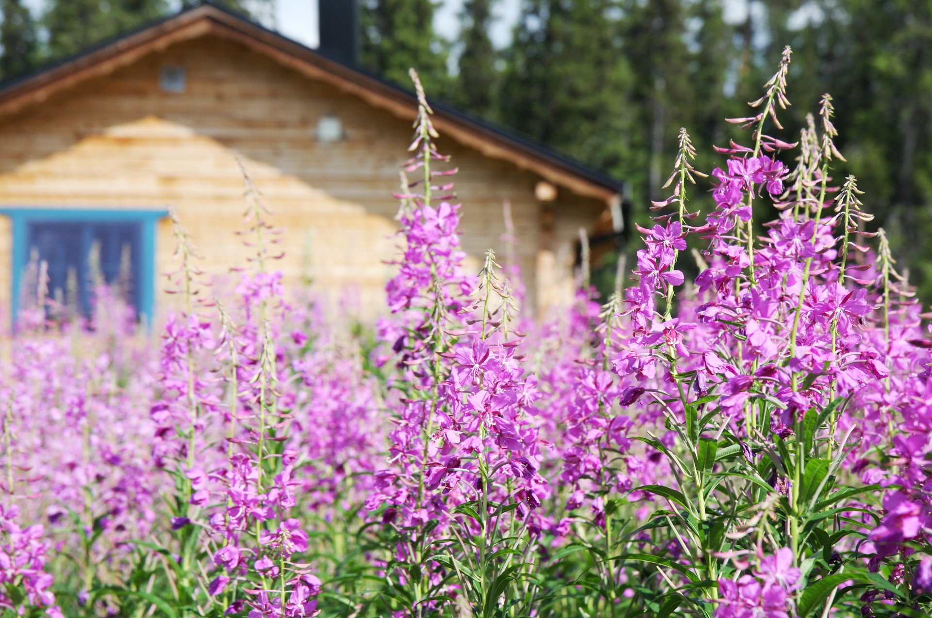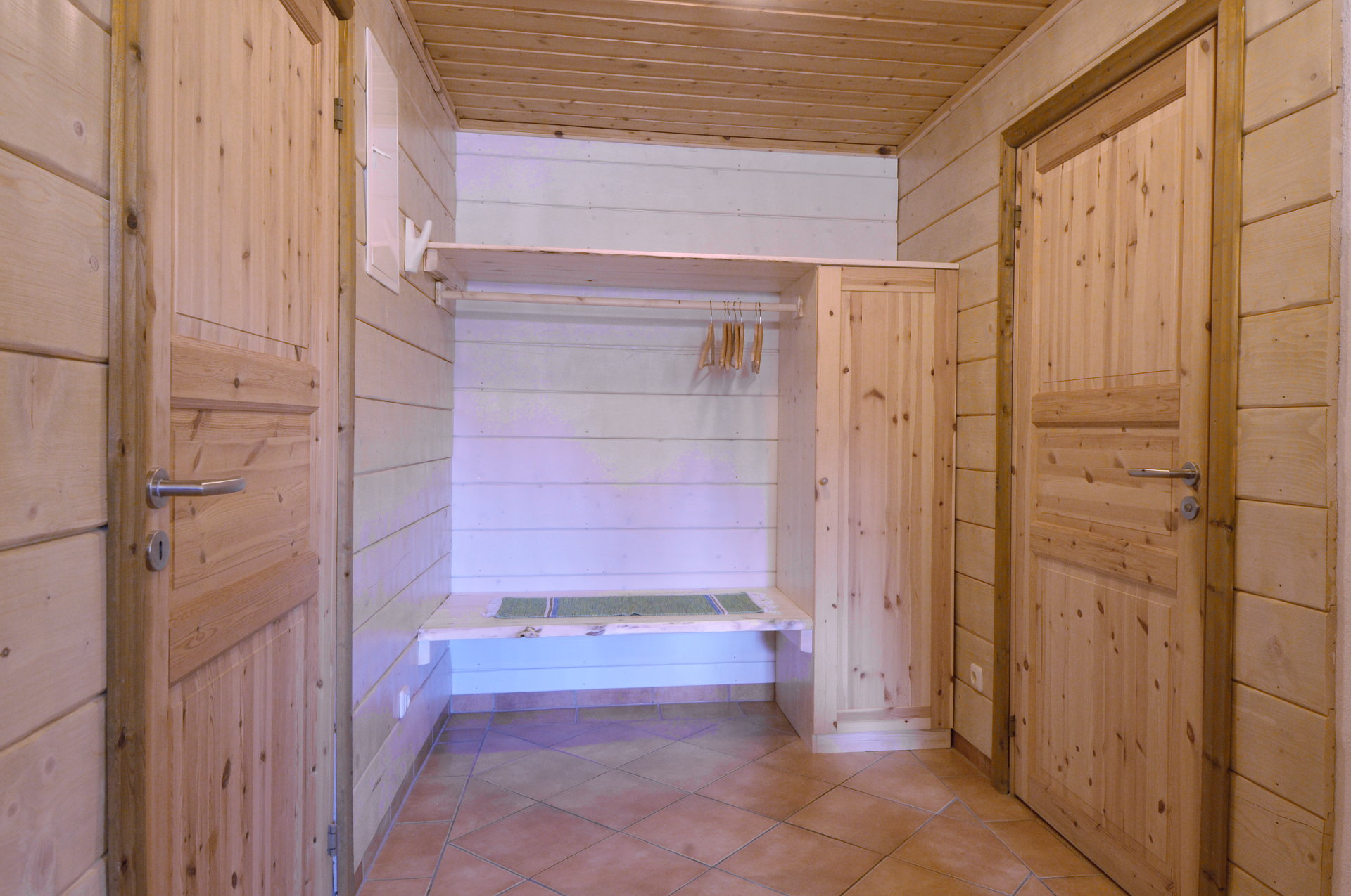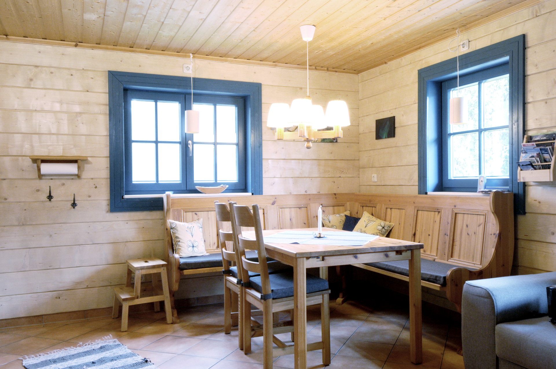 Vor dem überdachten Eingangsbereich befinden sich im Sommer Gartenstühle und ganzjährig je eine Tisch-Bank-Kombination aus Blockbohlen für das Sitzen im Freien.