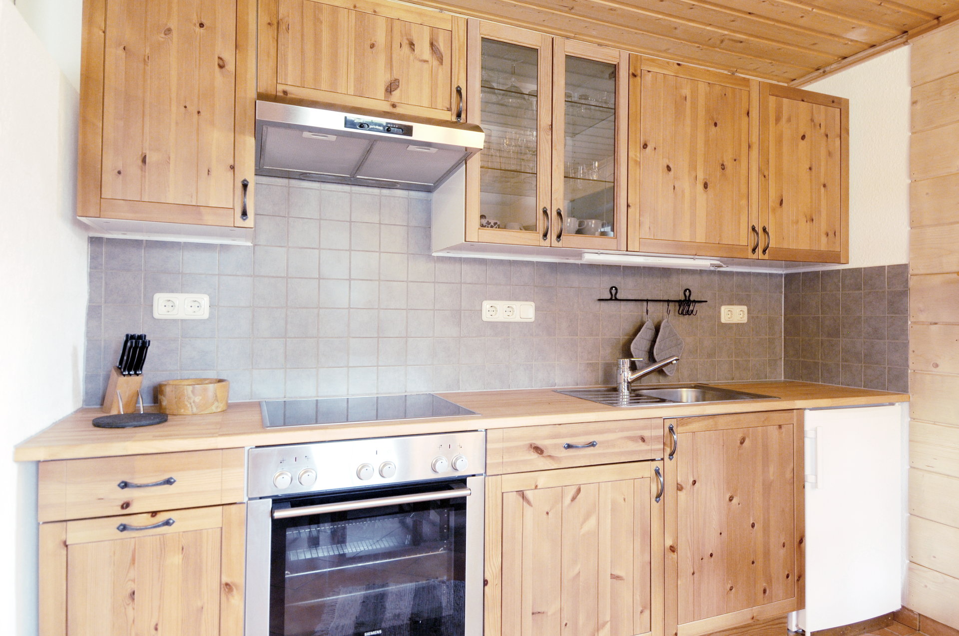 Gut ausgestattete Küche mit Kühlschrank und Gefrierfach, Herd und Backofen